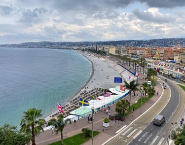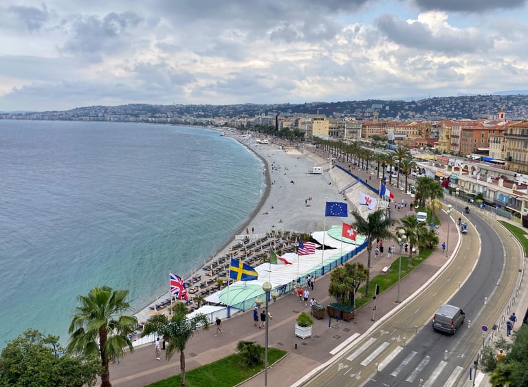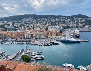 出門後,我信步走向著名的尼斯海邊。沿著指示往山上走大約十幾分鐘,便能抵達城堡山丘。從山頂俯瞰眼前一片無際的汪洋,山腳下一排排的小房子變得如樂高積木般可愛。在這裡,我感受到南法的美不只是陽光與海灘,而是一種遼闊的溫柔,山上的步道被翠綠環繞,鳥語花香,腳下是磨得光滑的石板路。漫步其中,彷彿時光倒流,回到了某個古老的歲月。曾經矗立於此的城堡與宮殿,在歷史的洪流中早已褪去榮華,只剩下幾塊遺跡靜靜訴說過往。每每站在這樣的地方,我總忍不住感嘆人類的渺小。一千年以後,這個世界又會是什麼模樣?想了想,其實也不重要了,畢竟正如百年孤寂所說「一百年後,沒有你,也沒有我」。