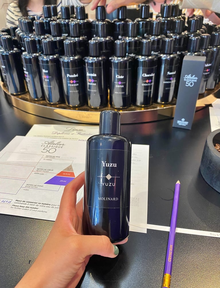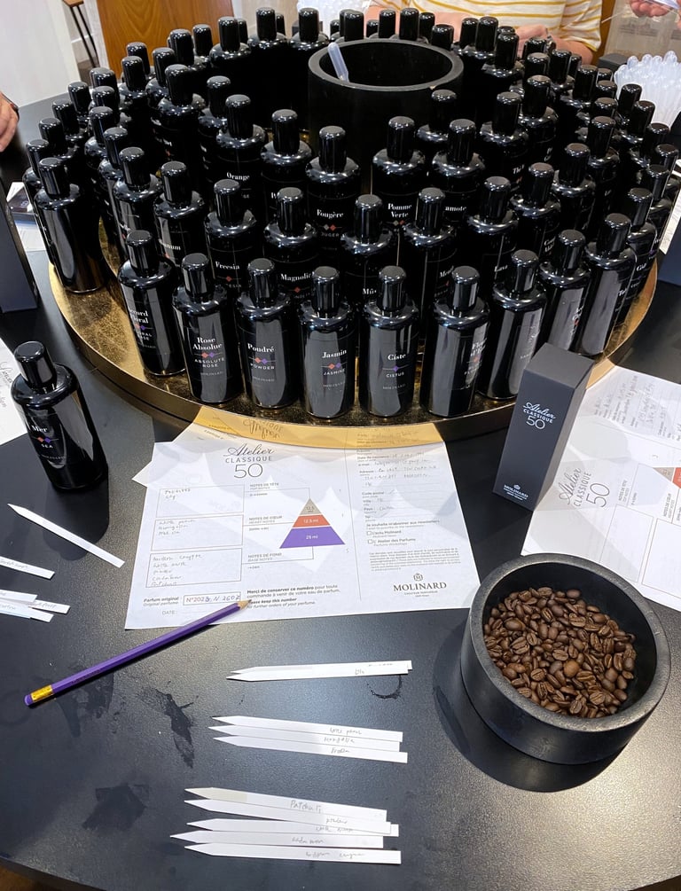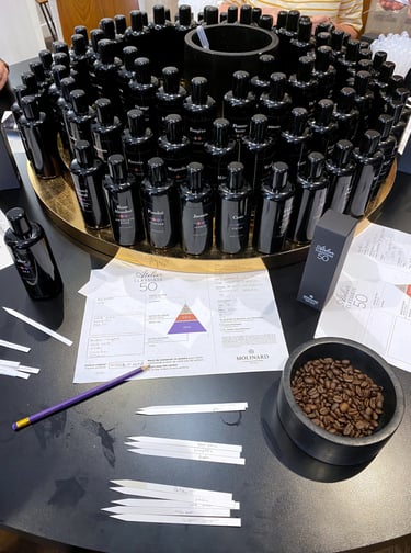 既然來到法國這個香水之都,我在下午參加Molinard香水工坊,親手調配一瓶屬於自己的香水。導師簡短講解了香水前調、中調與後調的區別,接著便讓我們從眼前數十瓶香精中,挑選自己喜歡的氣味,最後再將它們混合。