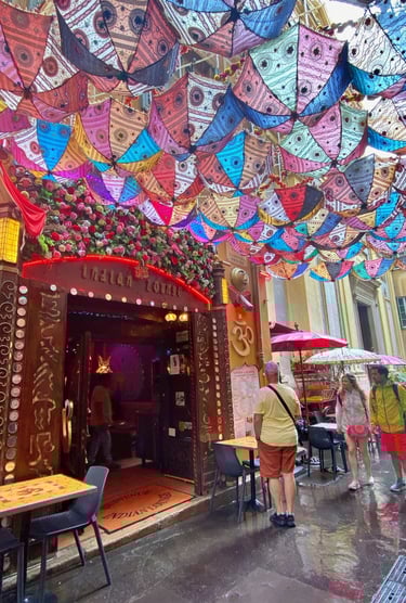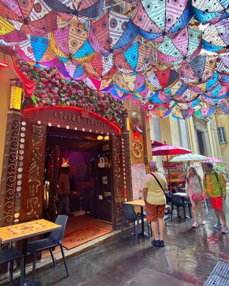 下山時,天空忽然飄起了細雨。我只好在山腳邊找個屋簷暫避,待雨勢轉弱,我轉往尼斯老城區逛逛。我很喜歡這裡的窄巷充滿鮮豔的色彩,市集傳來喧鬧的人聲,整個舊城洋溢著繽紛活力。