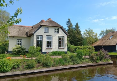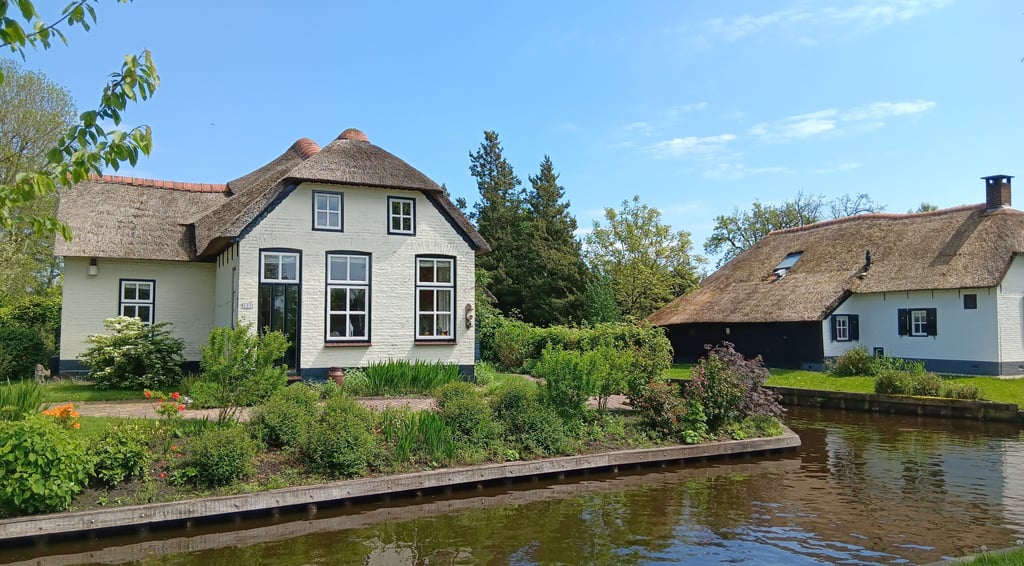 接著我參加了一天團,從市中心乘旅遊巴前往羊角村(Giethoorn),車程約一個半至兩小時。約午時抵達村口,導遊安排我們乘船遊覽一小時。這裡的建築仍保留傳統荷蘭風情,許多屋頂以蘆葦(reed)鋪成,僅少數現代房屋改用磚瓦。