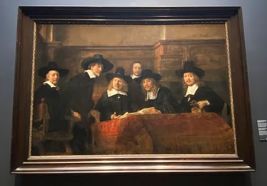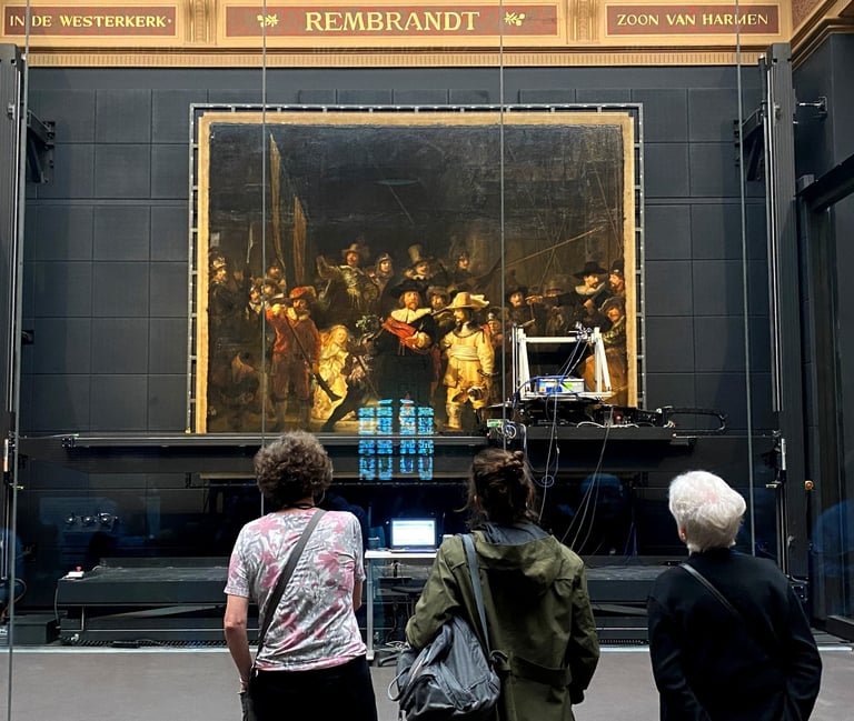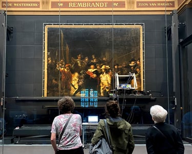 在人潮湧至前,我來到鎮館之寶《The Night Watch》面前。畫作正在進行修復,隔著玻璃依然能感受其磅礡氣勢。原來當年為了將它掛進市政廳(現今的Royal Palace),畫布四邊曾被裁切,如今我們見到的是經修剪的版本。