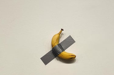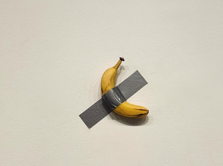 展場入口兩側的海報,分別選自Maurizio Cattelan的《Comedian》和Ryan Gander的《The End》,兩件作品皆位於地下樓層。關注藝術新聞的朋友,想必對這根貼著膠帶的香蕉不陌生。這件極具玩味的作品《Comedian》2019年於Art Basel Miami首度亮相,便以12萬美元售出。據美術館官方介紹,作品甚至貼心附上指示,提醒每隔七至十天就要換上新的香蕉。