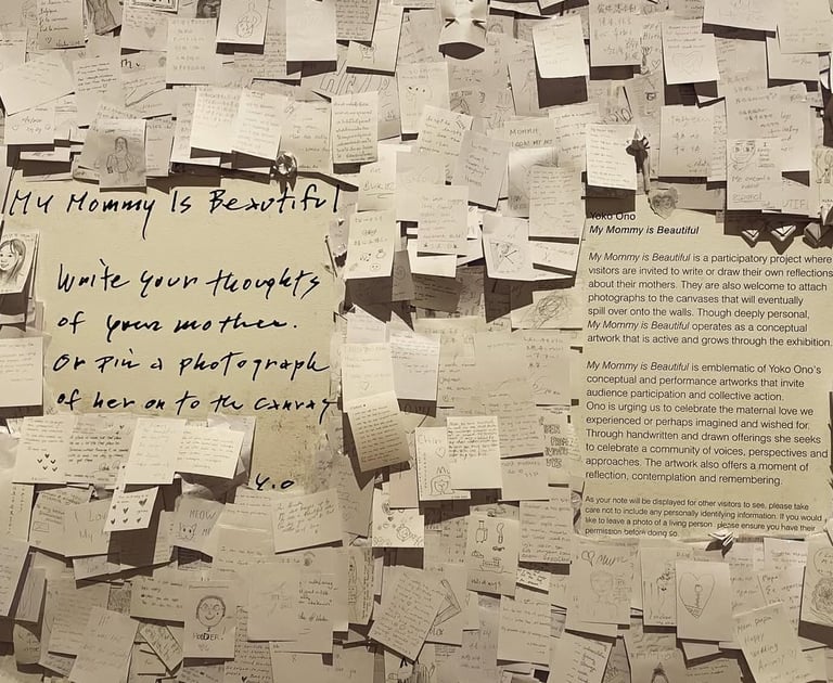 除了館外牆面貼有Yoko Ono的作品「I Love You Earth」,她的另一件參與式作品《My Mommy is Beautiful》位於二樓,邀請觀眾一同參與,寫下對母親的感受,將紙條貼於牆上,透過分享個人經驗,創造共同平台讓大家歌頌母愛。